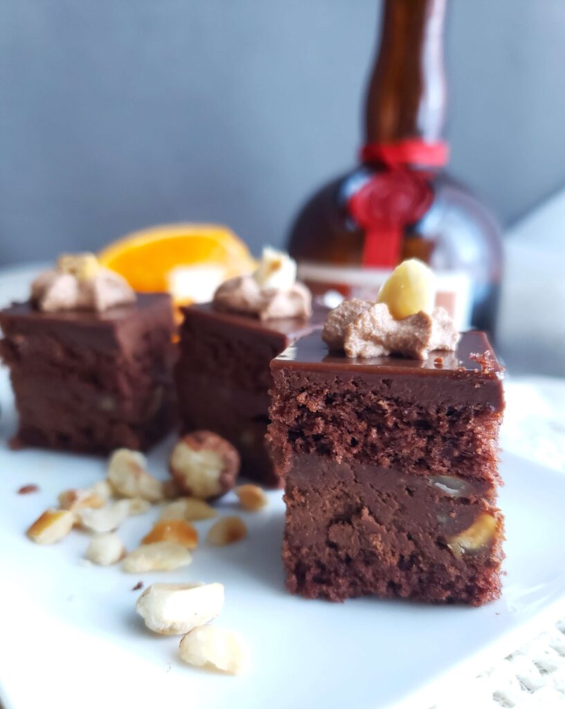 Génoise sans gluten au coco imbibée de Grand Marnier et jus d’orange, ganache chocolat noir, noisettes grillés